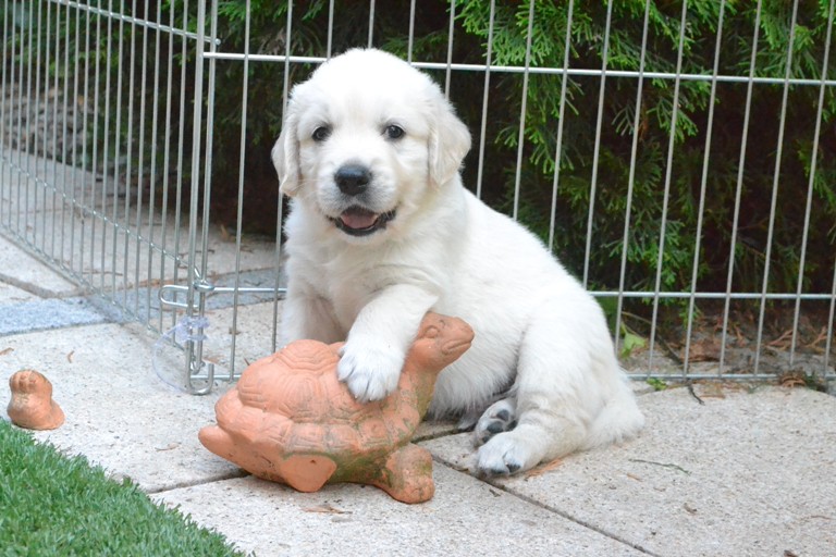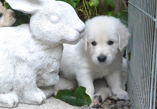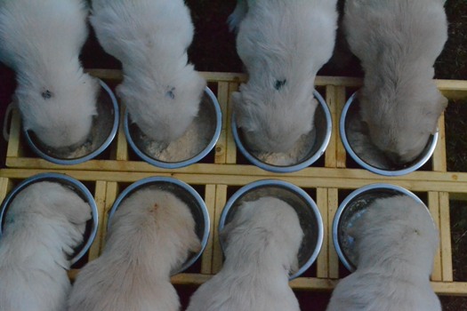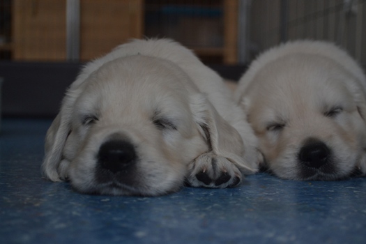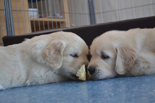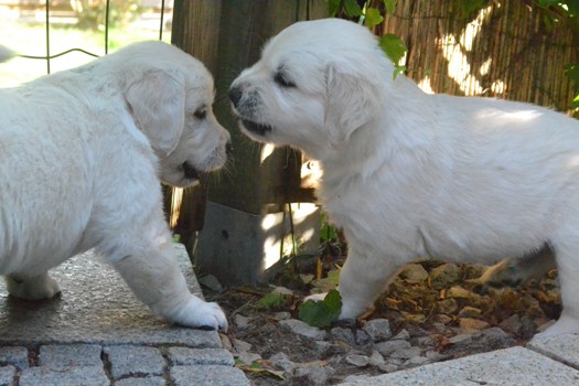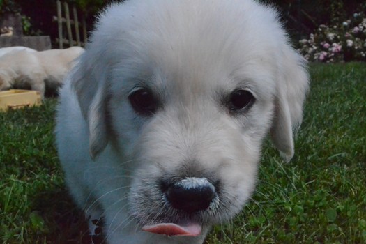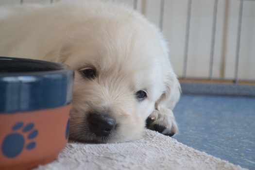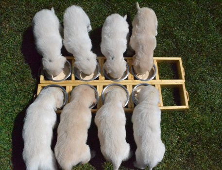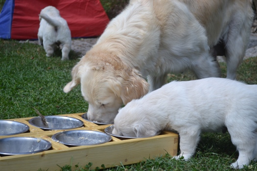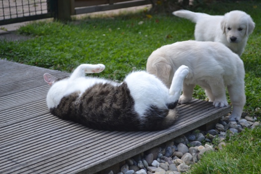 | oben na das hat geschmeckt | oben Kater Carlson ganz entspannt mit den Welpen |